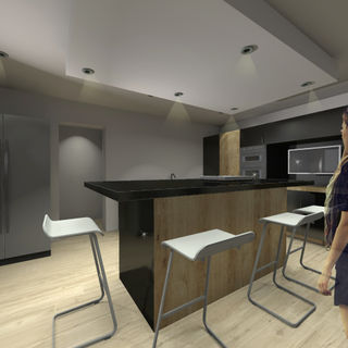Si on regarde le projet dans son ensemble, certaines modifications ont été apporté durant les travaux. En effet, le faux plafond initialement prévu au dessus de l'îlot central a été prolongé sur la longueur totale de la pièce pour créer une sensation de profondeur et fondre les poutres porteuses. De plus, nous avons décidé d'utiliser un parement briquette en fond de cuisine et sur un pan de mur du séjour pour créer un style industriel puisque dans un futur proche les clients veulent créer une verrière sans allège entre le séjour et la cuisine sous forme de porte coulissante, permettant ainsi d'avoir une cuisine fermée mais ouverte visuellement.